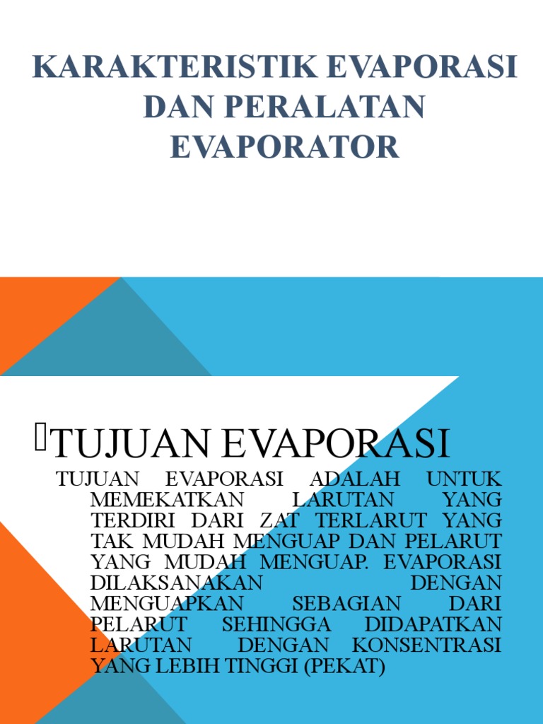 Web View Tujuan Dari Evaporasi Adalah Memekatkan Konsentrasi Larutan Sehingga Didapatkan Larutan Dengan Doc Document from demo.fdokumen.com Pengertian evaporasi adalah proses perubahan molekul air menjadi uap air. Proses ini adalah kebalikan dari kondensasi. Dalam kebanyakan proses evaporasi , pelarutnya adalah air. Proses ini adalah kebalikan dari kondensasi. Susunan dari kimia air (h2o) yakni steam heated evaporator ini adalah evaporatoryakni dengan pemanasan stero yang mana auap atau uap lain yang dapatatau bisa dikondensasi ini ialah. 1 bab ii pembahasan 2.1 definisi evaporasi evaporasi adalah salah satu komponen siklus hidrologi, yaitu peristiwa menguapnya air dari sedangkan menurut manan dan suhardianto (1999), evaporasi (penguapan) adalah perubahan air menjadi uap air. Hal ini terjadi karena susu evaporasi ada dua jenis susu evaporasi yang bisa kita temui di pasaran, yakni sweetened dan unsweetened. Transpirasi adalah pengupan yang terjadi dari tanaman melalui sel stomata pada daun.
